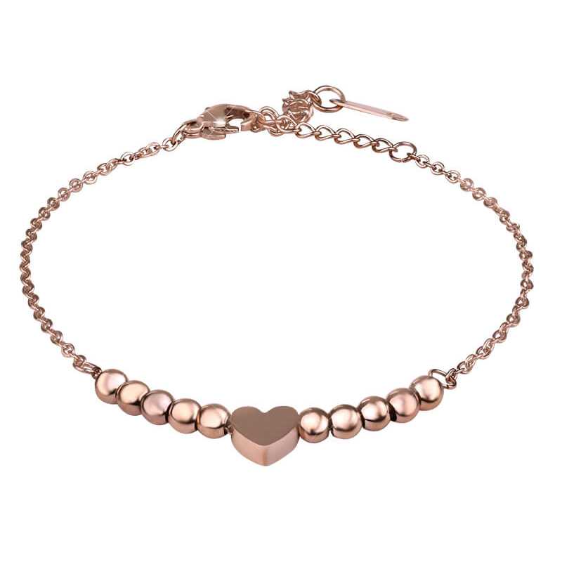 Elegantní bronzový řetízek se srdíčkem od značky Troli je ideálním doplňkem pro každou ženu, která touží po jemnosti a stylu. Tento pozlacený šperk v oblíbeném odstínu růžového zlata zaujme nejen svým designem, ale také kvalitním zpracováním. Délka 17 cm s možností prodloužení až o 5 cm zaručuje pohodlné nošení. Jemné korálky dodávají náramku na lehkosti a šarmu, zatímco praktické zapínání formou karabinky zajistí bezpečné uchycení. Ozdobte své zápěstí tímto jedinečným šperkem, který se skvěle hodí k různým příležitostem a podtrhne vaši osobnost. Dodává se v originálním balení, ideální jako dárek.