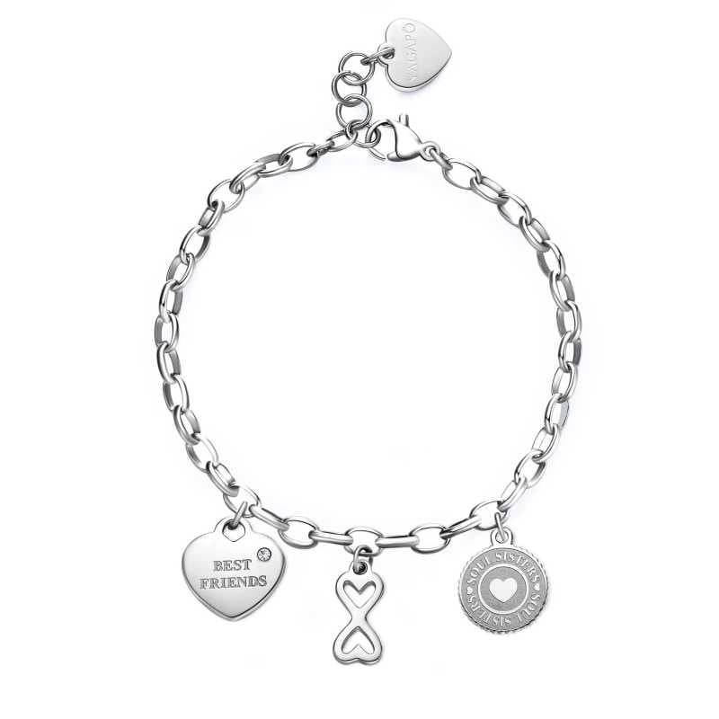 Elegance a symbolika se snoubí v krásném ocelovém náramku Přátelství Happy od italské značky S'AGAPÕ. Srdíčkový přívěsek s nápisem "BEST FRIENDS" doplněný čirým krystalem osloví každou ženu, která chce vyjádřit vděčnost své nejlepší přítelkyni. Kulatý přívěsek s textem "SOUL SISTER" přináší do designu osobní dotek. Náramek s délkou 18, 5 cm a zapínáním na karabinku je nejen módním doplňkem, ale také možností, jak k němu přidat další přívěsky z kolekce Happy. Je dodáván v originálním balení, ideální pro překvapení těm, které máte rádi. Vybavte se šperkem, který mluví za vás.