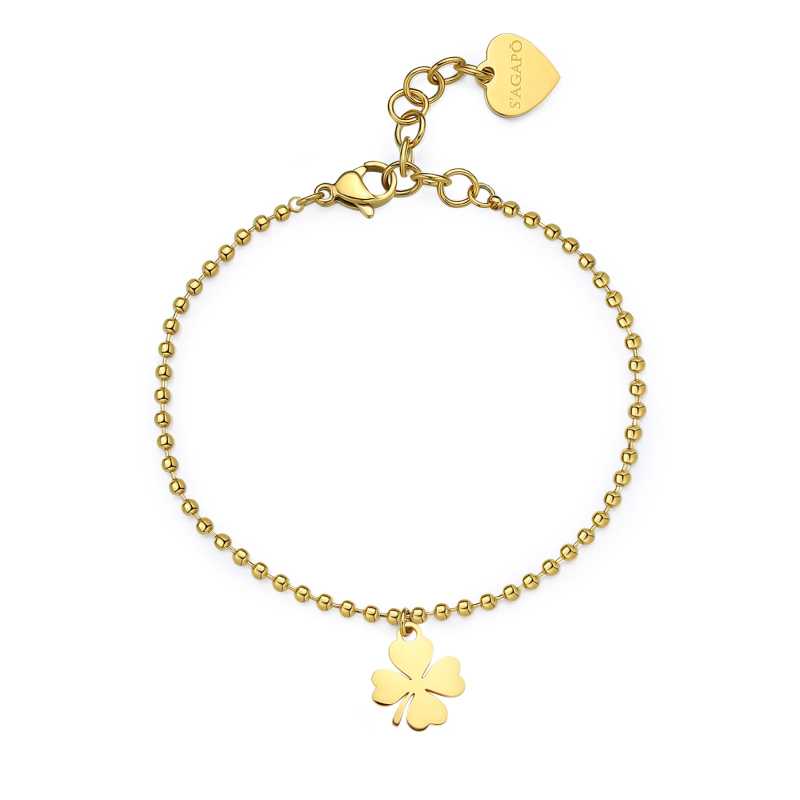 Pozlacený náramek se čtyřlístkem od italské značky S'Agapõ je ideálním doplňkem pro každou ženu, která touží po eleganci a symbolice štěstí. Vyroben z kvalitní oceli s PVD povrchovou úpravou, náramek zaručuje dlouhou životnost a odolnost proti opotřebení. Délka 19 cm a praktické zapínání na karabinku zajistí komfortní nošení. Přívěsek ve tvaru čtyřlístku přináší do vašeho stylu nádech originality, zatímco srdíčko s názvem značky podtrhuje jeho jedinečnost. Tento šperk se dodává v originálním balení, což z něj činí skvělý dárek. Ozdobte se kouskem, který nejen vypadá skvěle, ale také vás provází štěstím.