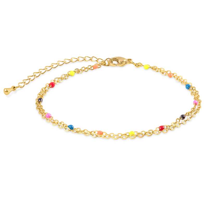 Dvojitý náramek se smaltovými korálky od značky Troli je skvělou volbou pro ženy, které chtějí ozvláštnit svůj styl. Vyrobený z kvalitní oceli a pokrytý zlatým PVD povlakem, tento šperk vyniká nejen svou estetikou, ale i trvanlivostí. Barevné smaltové korálky dodávají náramku živost a hravost, což z něj činí ideální doplněk pro každou příležitost. Délka náramku je 18 cm s možností prodloužení až o 5 cm, což zaručuje pohodlné nošení. Klasické zapínání na karabinku zajišťuje bezpečnost. Tento elegantní šperk se dodává v originálním balení, ideálním jako dárek pro milované.