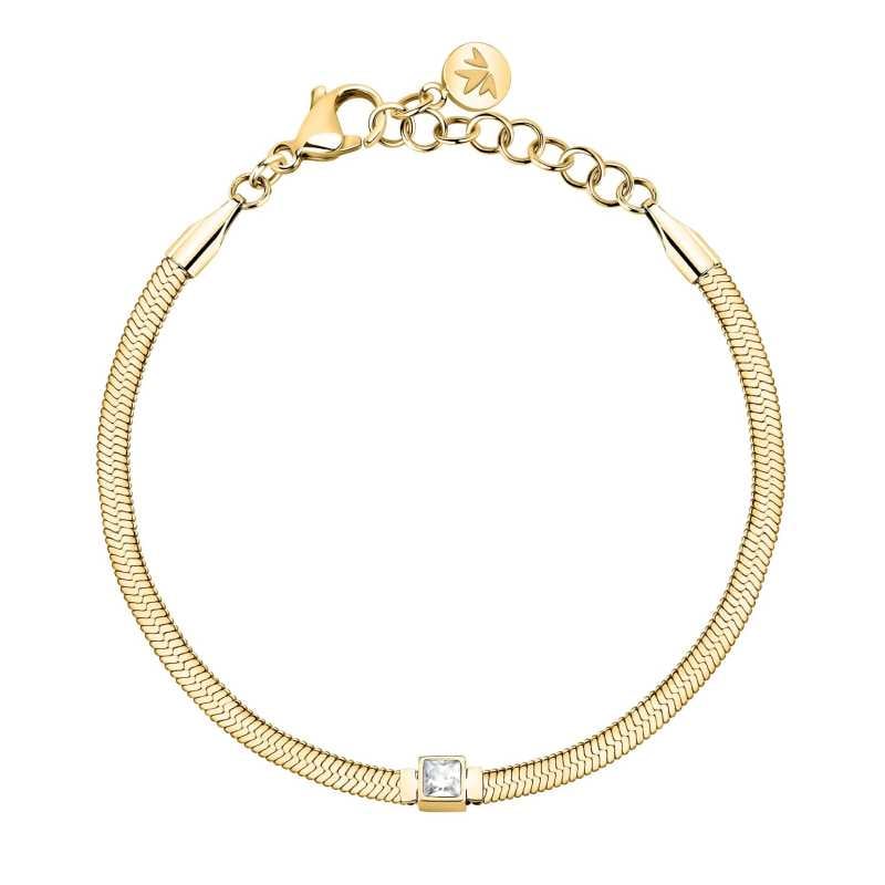 Pozlacený náramek s čirým krystalem Hádek Gioia SAVY36 od italské značky Morellato představuje dokonalou kombinaci elegance a současného designu. Vyrobený z kvalitní oceli a pokovený zlatým PVD povlakem, nabízí nejen krásný vzhled, ale i dlouhou životnost. Půvabný broušený krystal přitahuje pozornost a dodává šperku jedinečný lesk. Délka náramku činí 19 cm s možností prodloužení o 3 cm, což zaručuje pohodlné nošení pro každou ženu. Zapínání na karabinku zajišťuje bezpečné uchycení. Tento šperk se skvěle hodí pro každodenní nošení i speciální příležitosti. Ozdobte se kouskem, který podtrhne váš osobní styl.