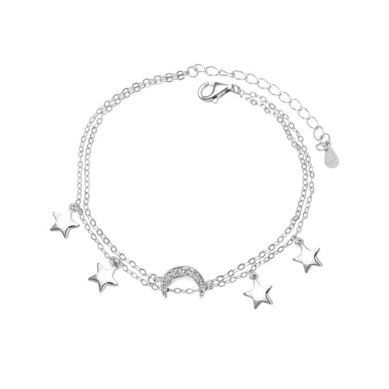 Dvojnásobná elegance a šarm se snoubí v tomto slušivém náramku ze stříbra od značky Beneto. Jeho precizní řemeslné zpracování a rhodiovaný povrch zajišťují dlouhotrvající lesk a minimalizují riziko alergických reakcí. Náramek o délce 17 cm s možností prodloužení až o 4 cm se pyšní jedinečným designem s ozdobami ve tvaru hvězdiček a třpytivým měsícem, který je osazen čirými zirkony. Tento nadčasový šperk dokonale doplní každodenní outfit i večerní look. Ozdobte své zápěstí elegantním kouskem, který přitahuje pozornost a podtrhuje vaši osobnost.