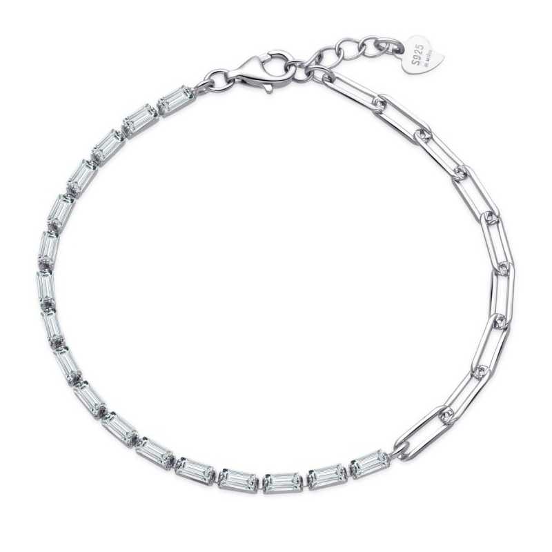 Stylový stříbrný náramek od značky MOISS je dokonalým spojením elegance a nadčasového designu. Vyrobený ze sterlingového stříbra s rhodiovaným povrchem, náramek snižuje riziko alergických reakcí a zachovává svůj lesk po dlouhou dobu. Jeho velké oválné články jsou bohatě zdobeny kubickými zirkony s bagetovým brusem, které dodávají šperku jiskru a šarm. Délka náramku činí 18 cm, s možností prodloužení o 2 cm, což zaručuje pohodlné nošení. Zapínání na karabinku zajišťuje snadné a bezpečné nasazení. Tento šperk dokonale ozdobí každé zápěstí a stane se skvělým doplňkem pro každou příležitost.