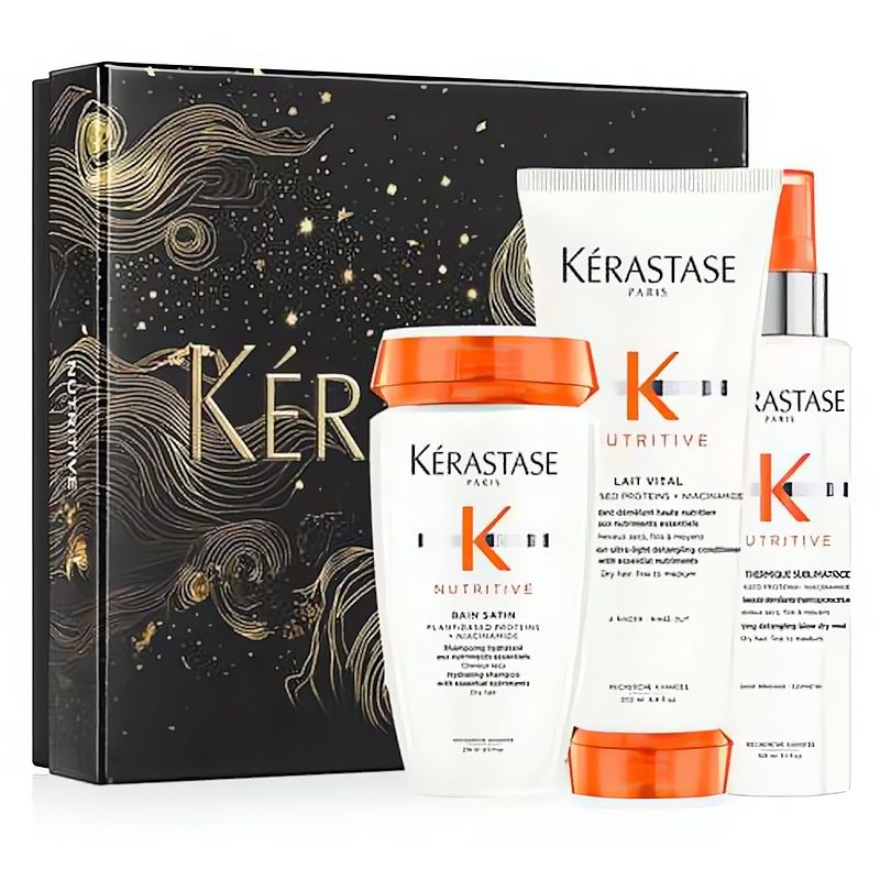 Dárková sada vlasové péče Nutritive Fondant Holiday Set přináší komplexní řešení pro jemné a středně suché vlasy. Obsahuje hydratační šampon Nutritive Bain Satin, který šetrně čistí a vyživuje vlasy díky obsahu nikotinamidu a rostlinných proteinů. Rozčesávací kondicionér Nutritive Lait Vital dodává intenzivní hydrataci a obnovuje pružnost, zatímco tepelná ochrana Nutritive Lotion Thermique chrání vlasy před teplem až do 230 °C a usnadňuje styling. Tato sada je ideální pro každodenní péči, zanechává vlasy lesklé, hebké a snadno rozčesatelné. Dopřejte svým vlasům to nejlepší.