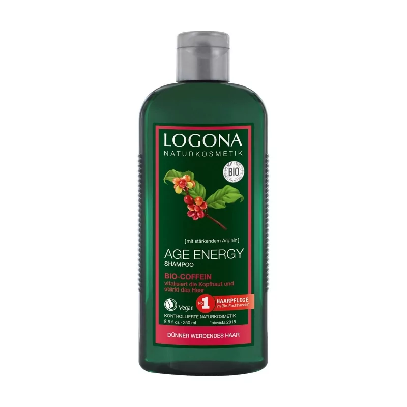 Regenerační šampon Logona BIO kofein Age Energy posiluje jemné, slabé vlasy a podporuje jejich růst a vitalitu. Kofein ve spojení s Aloe vera zanechává vlasy jemné, pevnější, odolnější a zdravější. Šampon pečuje o jemné vlasy s tendencí k plihnutí a ztrátě objemu. Kofein posiluje vlasy, oživuje je a stimuluje vlasovou cibulku, podporujíc rychlejší růst nových vlasů. Výtažky z granátového jablka a goji berries dodávají vlasům zdravý lesk. Aloe vera pečuje o vlasovou pokožku a vlasy, zanechává je jemné, snadno rozčesatelné a hydratované. Kofeinový šampon podporuje růst vlasů a dodává zdraví, vitalitu a objem jemným vlasům. S Logonou získáte přírodní péči o vlasy od značky s dlouholetou tradicí a respektem k přírodě.