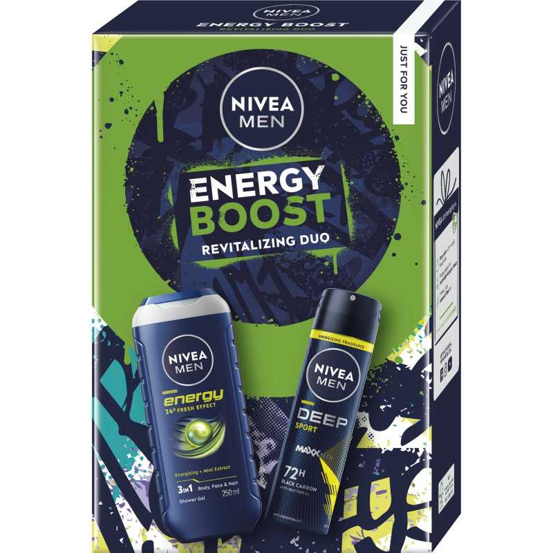Dárková sada Box Deo Sport od značky NIVEA je ideálním řešením pro muže, kteří hledají osvěžení a ochranu v jednom balení. Obsahuje sprchový gel pro muže Energy o objemu 250 ml, který díky technologii HYDRA IQ zajišťuje zdravý vzhled pokožky a povzbuzující mužnou vůni s chladivým mentolem. Po každém použití pocítíte příliv nové energie. Sada dále obsahuje antiperspirant ve spreji Men Deep Sport 150 ml, který poskytuje spolehlivou ochranu před pocením a zápachem až na 72 hodin. Tento produkt s antibakteriálním složením a svěží vůní dodává pocit čistoty a svěžesti. Vhodné pro každodenní použití.