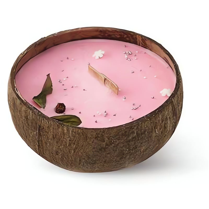 Kokosová miska, 100% sójový vosk , dřevěný knot, 100% esenciální a vonné oleje, ruční zdobení sušenými květy a bylinkami