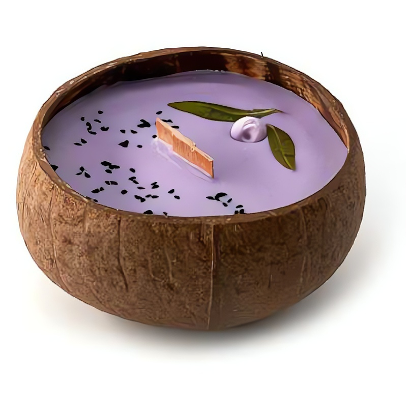 Kokosová miska, 100% sójový vosk , dřevěný knot, 100% esenciální a vonné oleje, ruční zdobení sušenými květy a bylinkami.