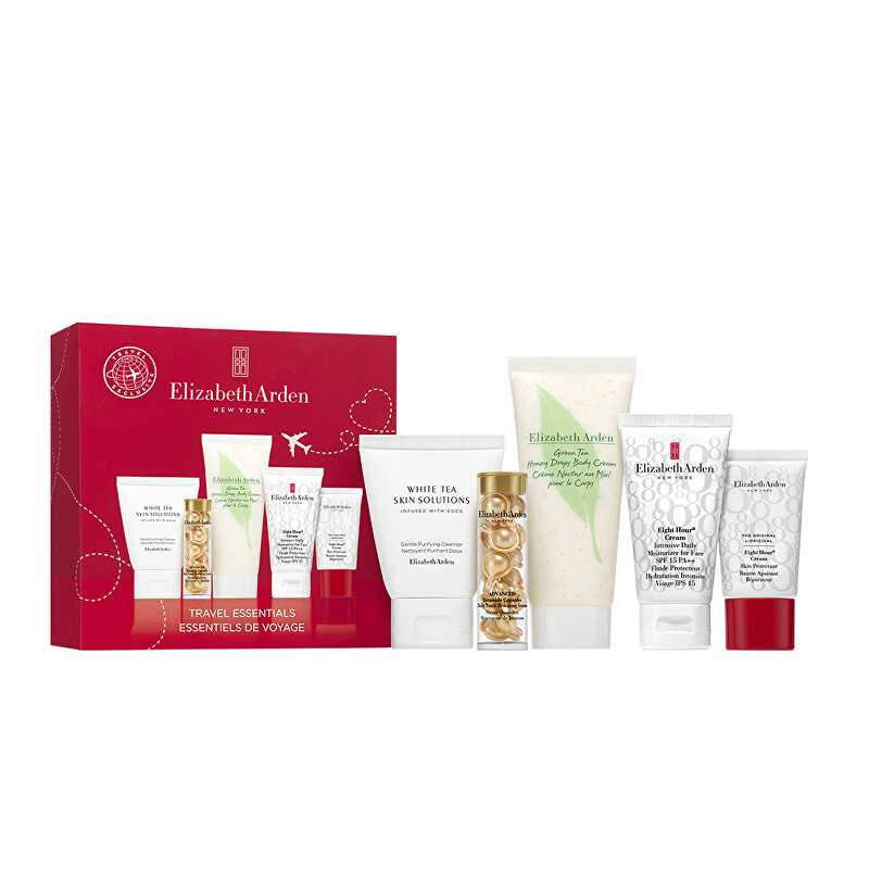 Dárková sada Travel Essentials od značky Elizabeth Arden je ideálním společníkem pro každou ženu, která si chce dopřát kvalitní péči o pleť a tělo i na cestách. Obsahuje tělový krém Green Tea, jemný čisticí pleťový gel White Tea, hydratační krém SPF 15 Eight Hour Cream, ochranný krém Eight Hour Cream a pleťové sérum v ceramidových kapslích. Tělový krém s osvěžující vůní zeleného čaje zanechává pokožku hebkou a hydratovanou, zatímco čisticí gel účinně odstraňuje nečistoty a make-up. Hydratační krém chrání pleť před slunečním zářením a extrémními podmínkami. Ochranný krém dodává pleti výživu a zklidňuje podráždění. Sérum v kapslích obnovuje strukturu pleti a minimalizuje vrásky. Tato sada je perfektní volbou pro zdravou a krásnou pleť kdekoli.