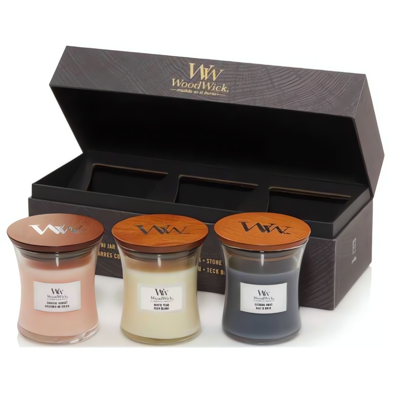 Dárková sada Woodwick Mini Jar Gift Set přináší do vašeho domova tři jedinečné vůně: Coastal Sunset, Solar Ylang a Evening Onyx. Každá svíčka o hmotnosti 85 g je vybavena dřevěným knotem, který při hoření vytváří příjemný zvuk praskajícího ohně, čímž umocňuje atmosféru klidu a pohody. Coastal Sunset evokuje letní večery u moře, Solar Ylang osvěžuje exotickými tóny ylang-ylang a citrusů, zatímco Evening Onyx přináší smyslnou kombinaci černé orchideje a jasmínu. Svíčky jsou ideálním dárkem pro milovníky kvalitních vůní a elegantního designu. Dlouhá doba hoření a intenzivní aroma zajistí nezapomenutelný zážitek.