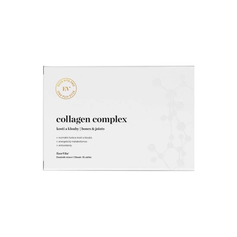 Collagen Complex od značky Ecce Vita je revoluční směsí aktivních látek pro podporu pohybového aparátu a celkového zdraví. Obsahuje hydrolyzovaný kolagen, glukosamin, chondroitin, kadidlovník, MSM a další důležité látky pro Vaše tělo. Kolagen je klíčový pro hydrataci, pružnost a mladistvou pokožku. Vitamin C podporuje tvorbu kolagenu a má mnoho dalších pozitivních účinků. Díky přírodním složkám jako je kurkuma, jírovec nebo kyselina hyaluronová poskytuje Collagen Complex komplexní péči o Vaše klouby, kosti a celkové zdraví. Vyzkoušejte tento kvalitní produkt od značky Ecce Vita a buďte fit a zdraví!