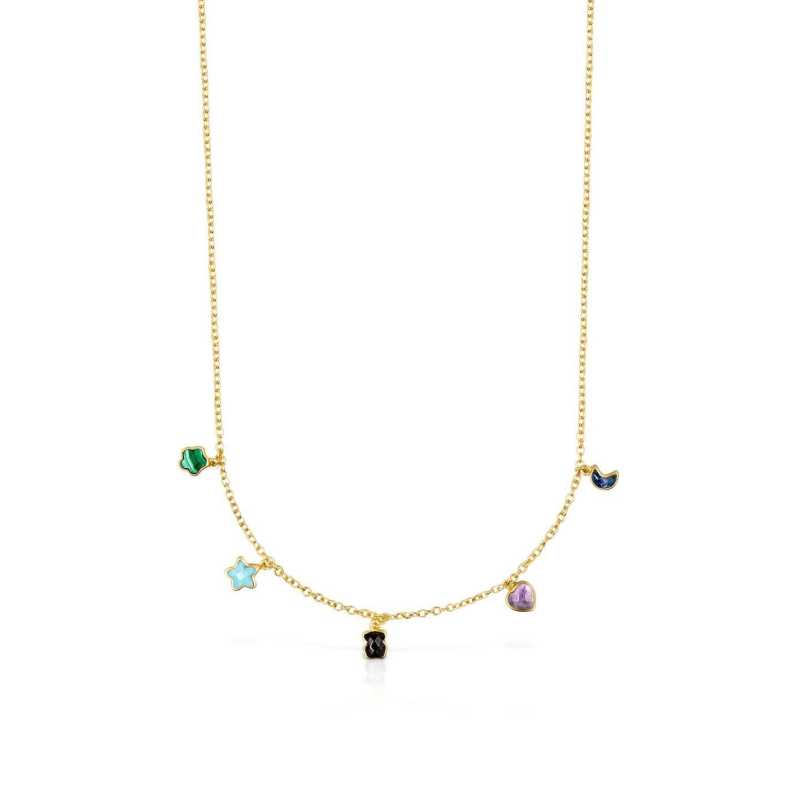 Pozlacený náhrdelník s přívěsky Glory od značky Tous je elegantním doplňkem, který zaujme jemnými detaily a kvalitním zpracováním. Vyrobený ze sterlingového stříbra a pozlacený 18karátovým žlutým zlatem, tento šperk je synonymem vkusu a stylu. Hravé přívěsky s motivy srdcí, květin a hvězd jsou osazeny krásnými kameny jako ametyst, malachit, onyx, tyrkys a sodalit, které dodávají náhrdelníku jedinečný šarm. Délka 45 cm a praktické zapínání na karabinku zajišťují pohodlné nošení. Tento náhrdelník se stane perfektním doplňkem pro každou příležitost a oslní vás svou barevnou variabilitou.