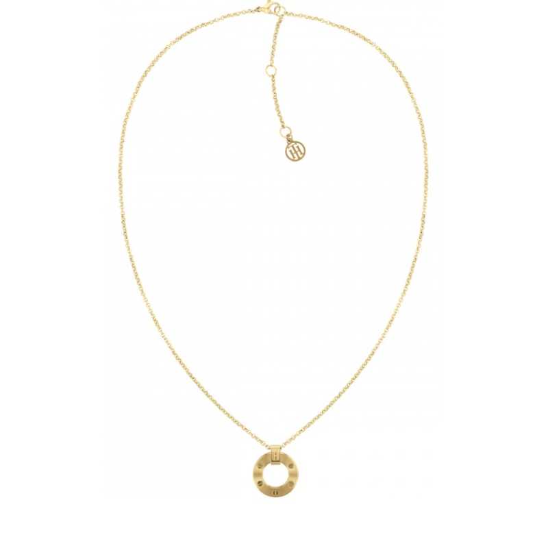 Nadčasový pozlacený náhrdelník značky Tommy Hilfiger je vyroben z kvalitní oceli a pokrytý PVD povlakem, který zaručuje jeho dlouhou životnost a odolnost vůči opotřebení. Elegantní design s kruhovým přívěskem dodá každému outfitu šmrnc. Pro optimální péči o šperk doporučujeme uchovávat ho v suchu a chránit před kontaktem s vodou a chemikáliemi, což zajistí jeho lesk a krásu po dlouhou dobu. Tento náhrdelník, s délkou 45 cm a možností prodloužení, je ideálním doplňkem pro každou příležitost. Původní kvalita značky a pečlivé zpracování činí z tohoto šperku skvělou volbu pro každou ženu.